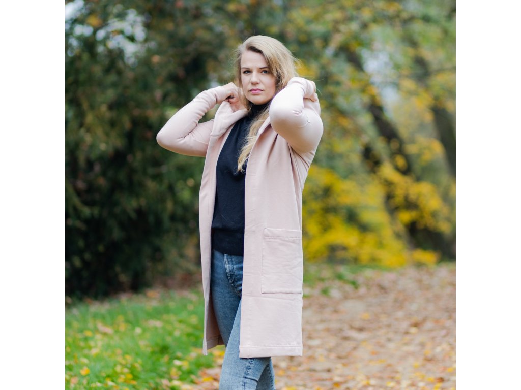 Volnočasový kardigan z počesané teplákoviny, který se hodí pro každou příležitost. Je vhodný především do chladnějších měsíců.