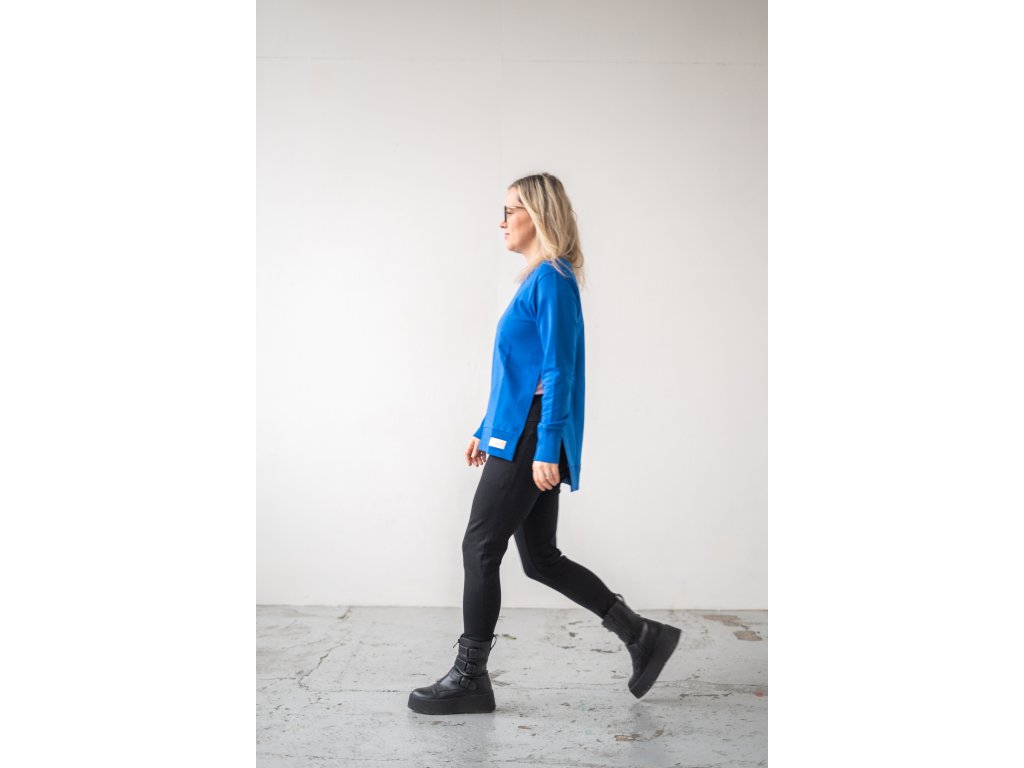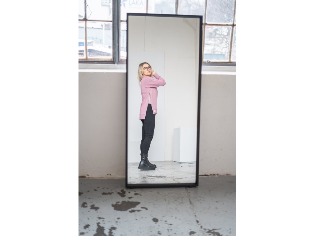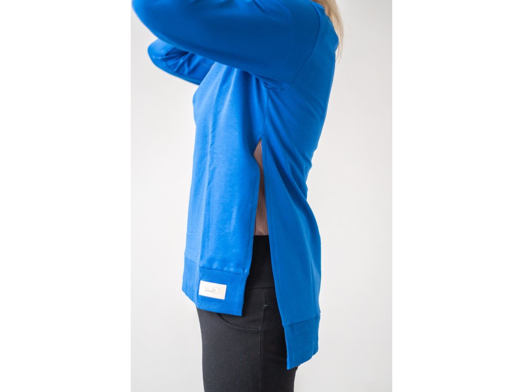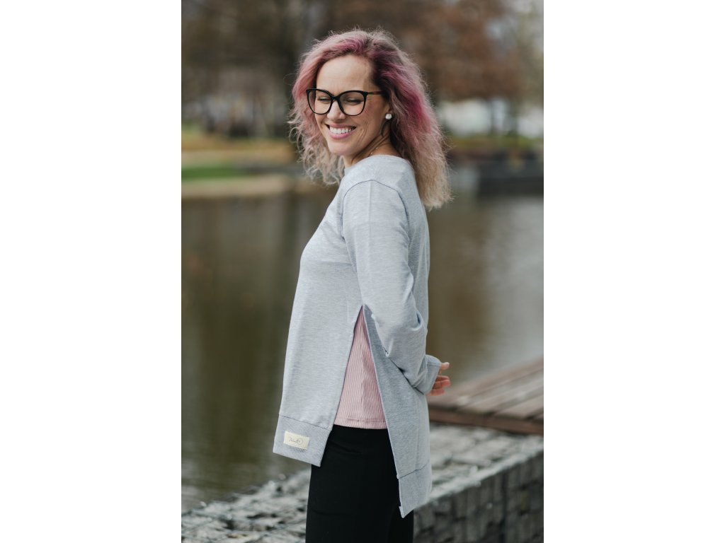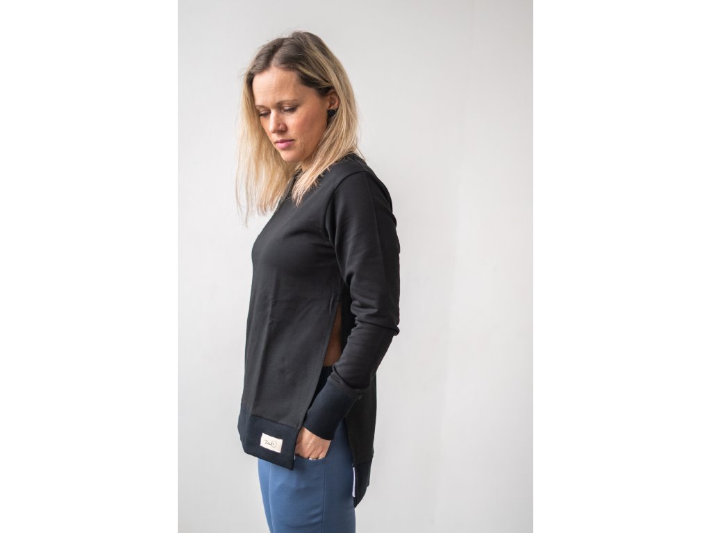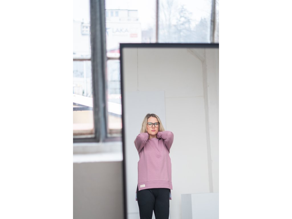 Mikina z nepočesané teplákoviny s rozparky a prodlouženým zadním dílem poskytuje volnost pohybu a zároveň dodává šmrnc každému outfitu. Zajímavým prvkem je pruh kontrastní látky z rubu.