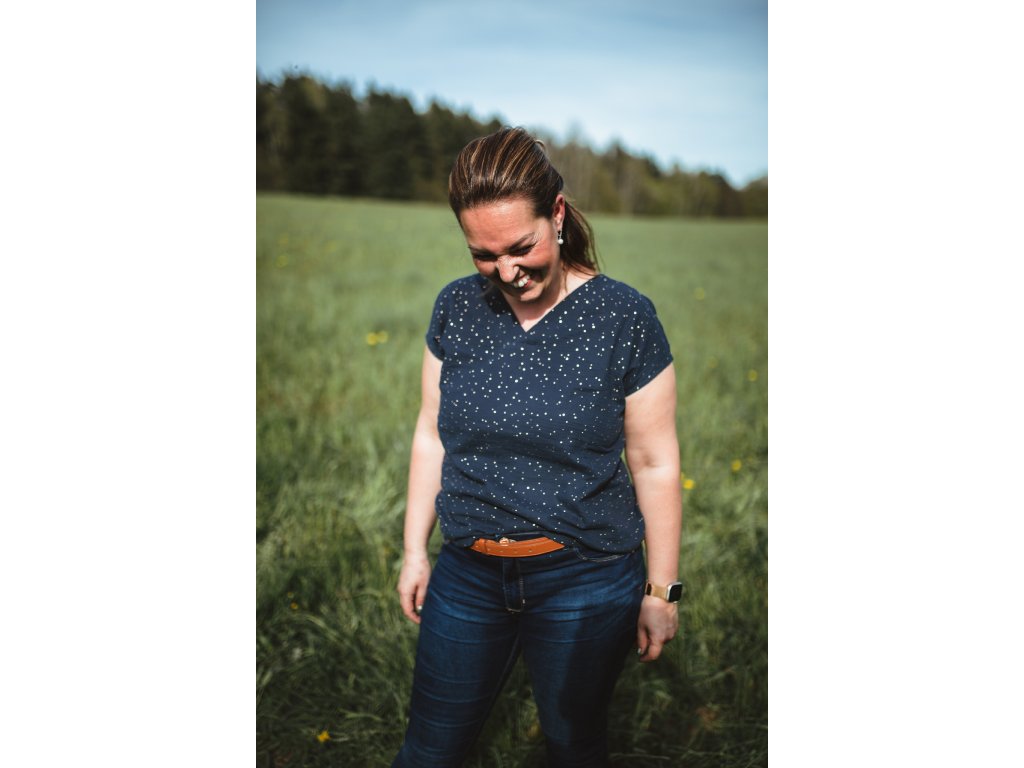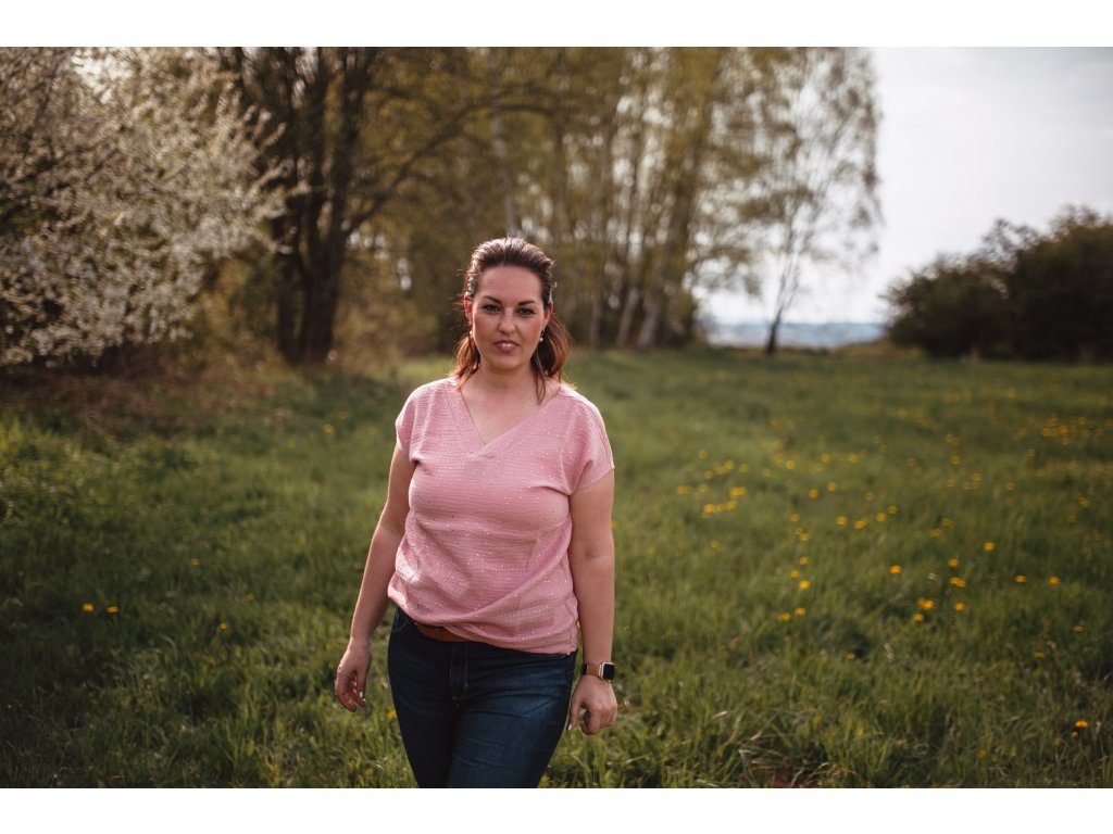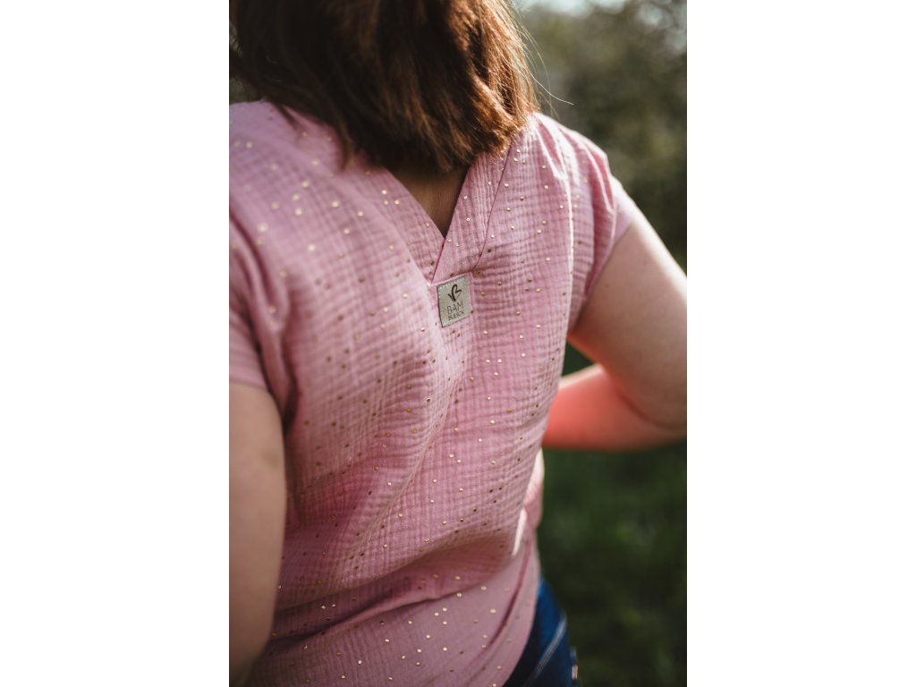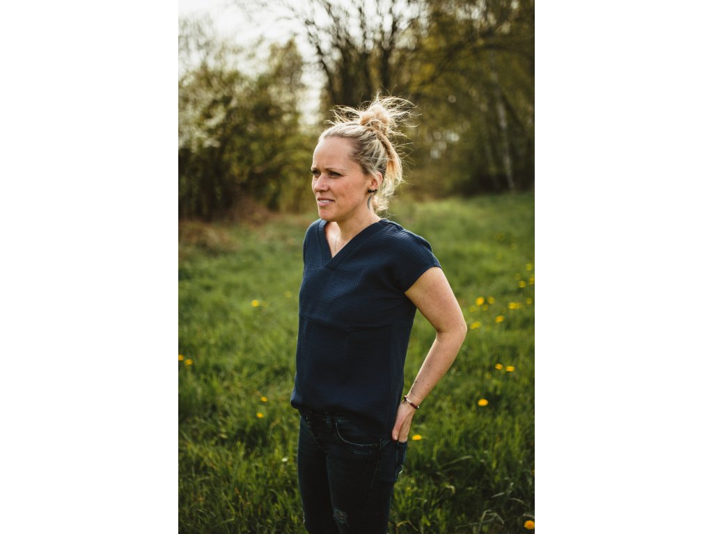 Mušelínové volnočasové tričko s výstřihem do V vepředu i vzadu. Je neskutečně prodyšné. Vlastní slušivý střih. Je pohodlné, vzdušné a lehké, výborný materiál na léto. Lehká struktura umožňuje mušelínu "dýchat" a zajišťuje dostatečnou cirkulaci vzduchu, čímž snižuje riziko přehřátí.